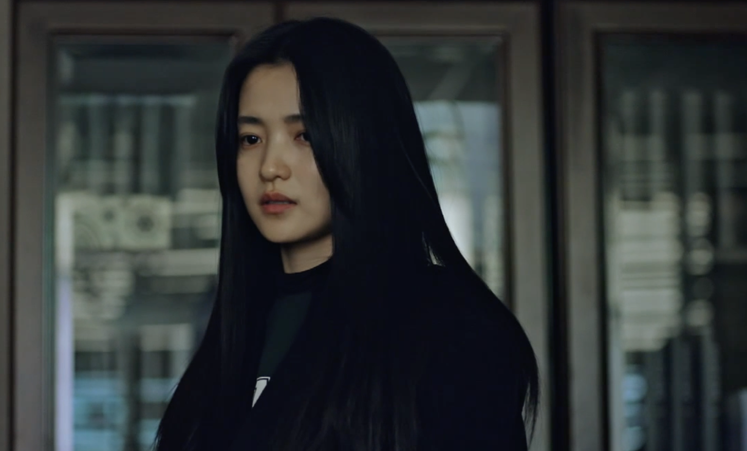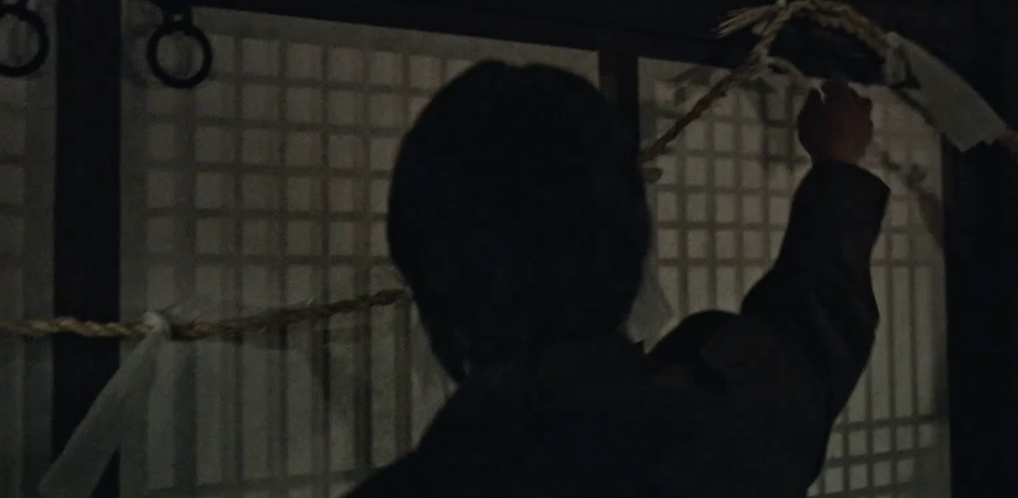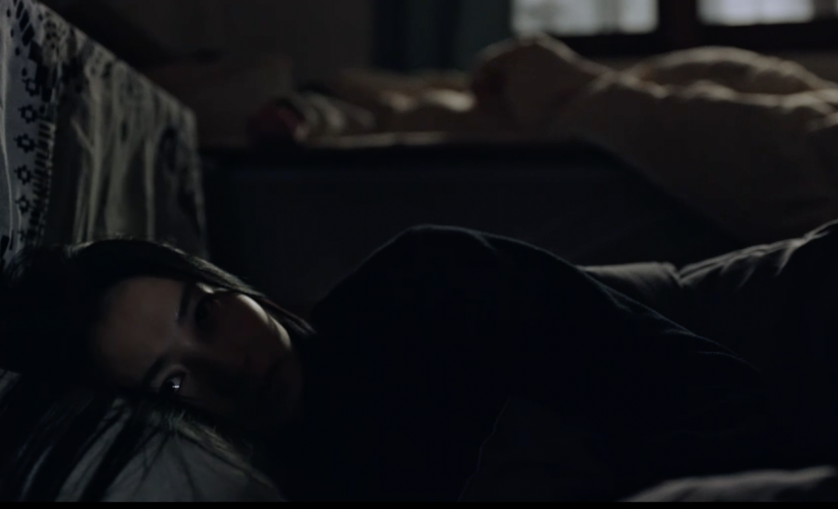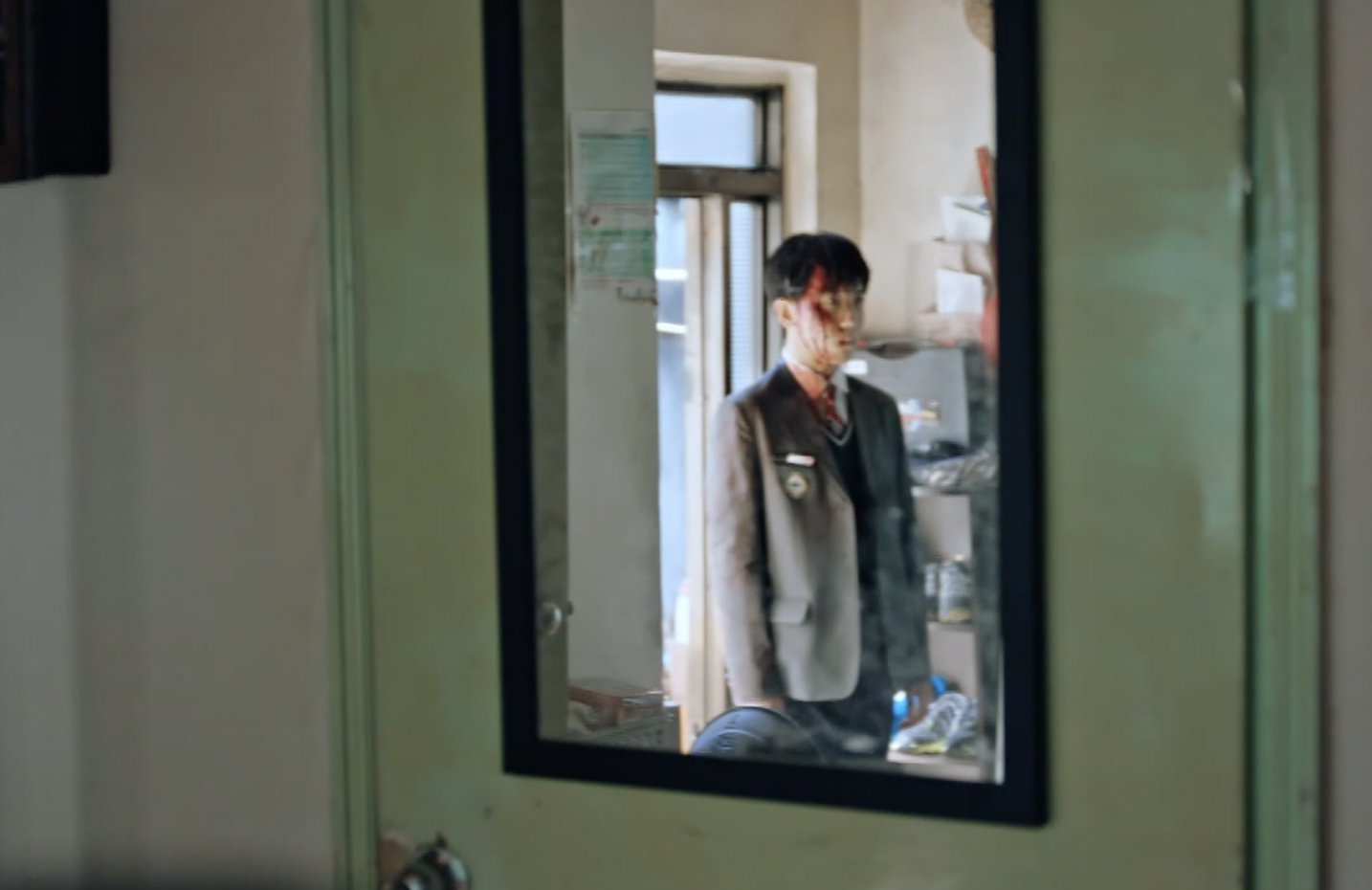 자고 있는 산영의 뒷모습 너머로 거울에 비친, 일어서는 산영의 모습(악귀)는 문밖을 나선다.