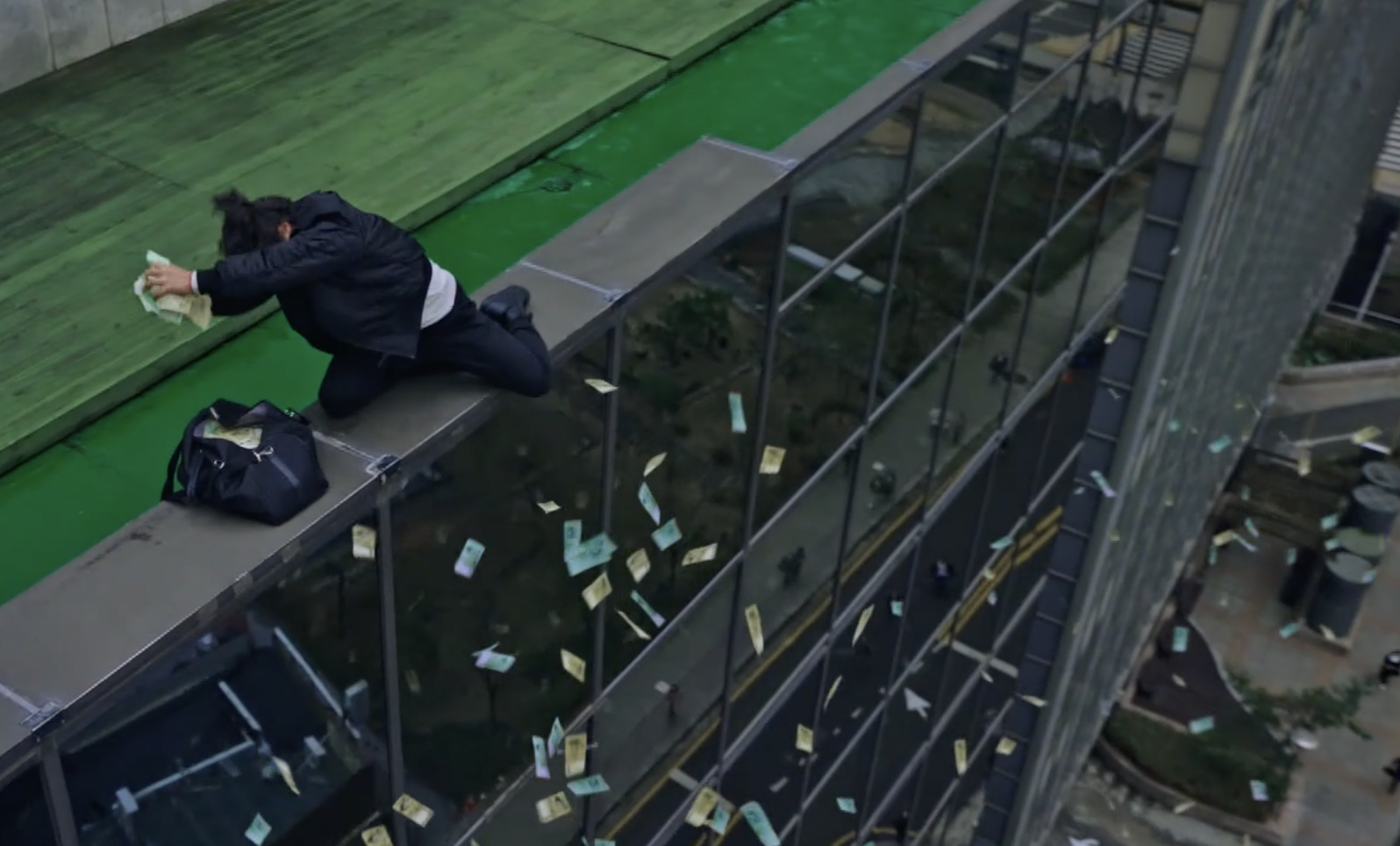 건물 꼭대기에서 미친듯이 돈을 뿌려댄다. 겁에 질린 표정으로 말한다.
