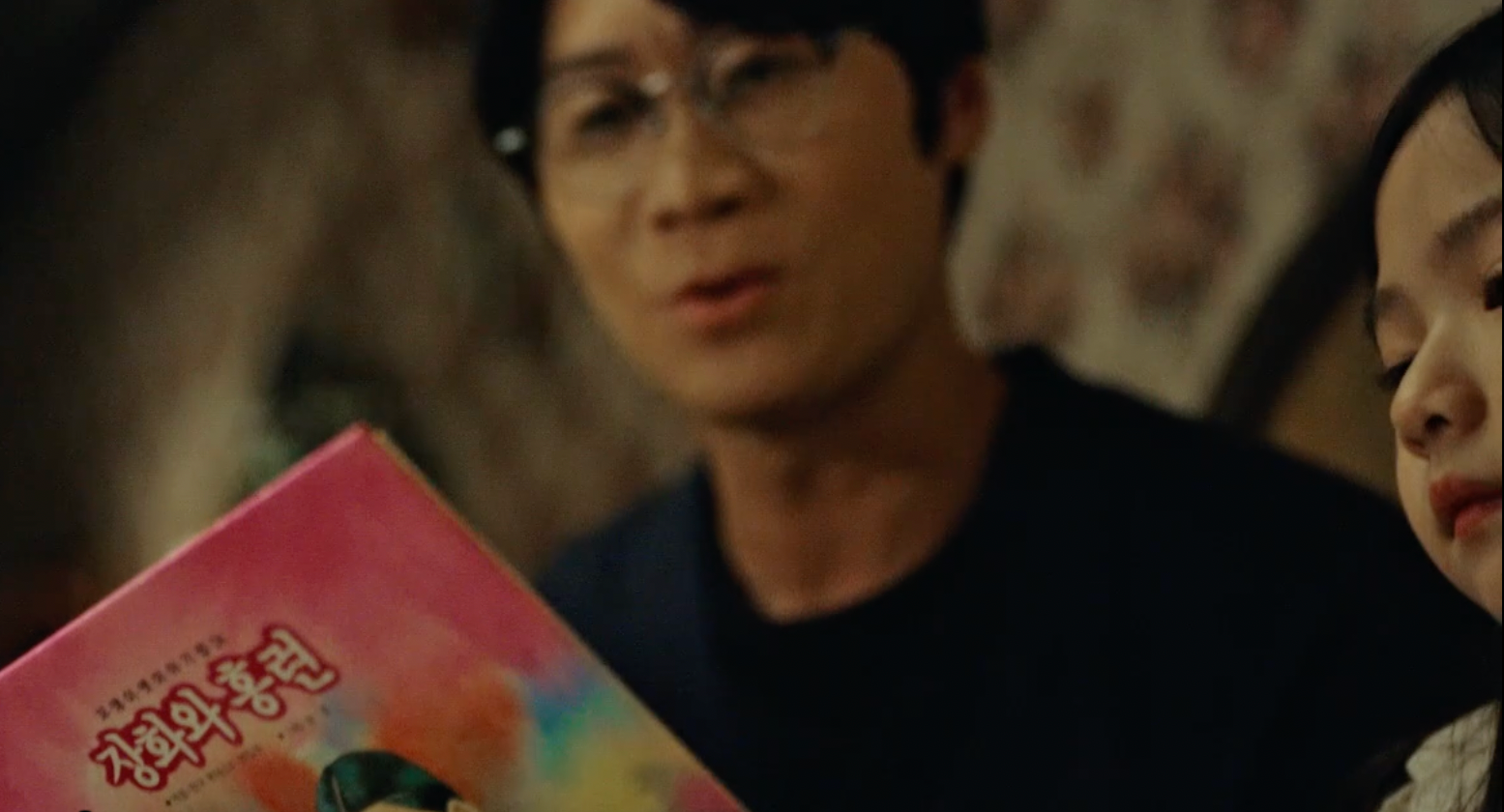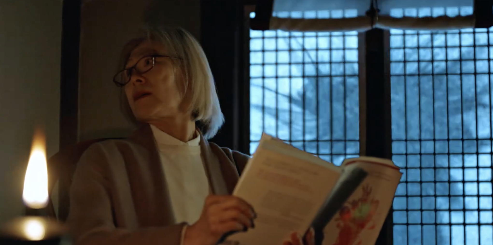 비가 추적추적 내리는데 구강모 어머니(석란)는 책을 읽고 있다.