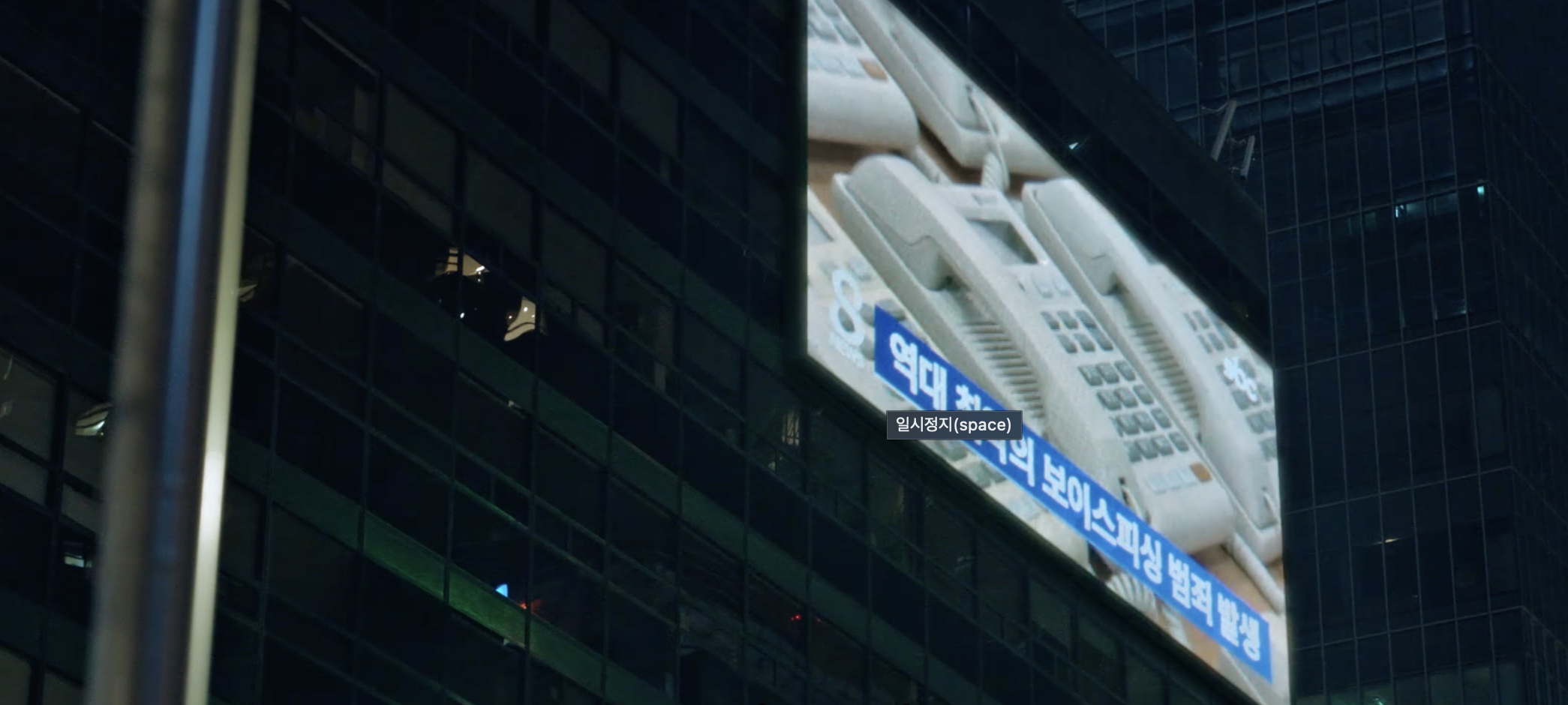 저마다 바쁘게 갈길을 재촉하는 사람들 너머로 보이스피싱 범죄를 다루는 뉴스를 다루는 전광판이 보인다.