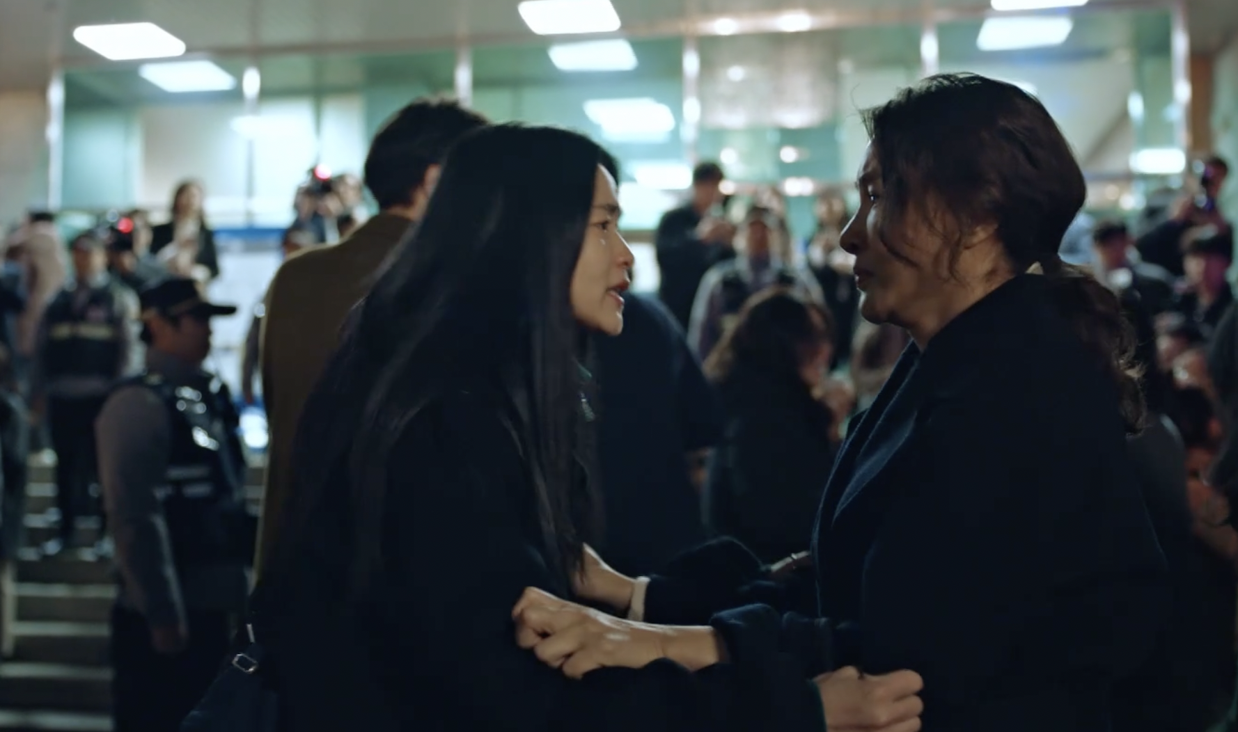 보이스피싱범 얼굴을 보는 모녀. 잡혀가는 와중에 피해자들에게 하고싶은 말이 있냐는 질문에 비웃는 얼굴을 보인다.