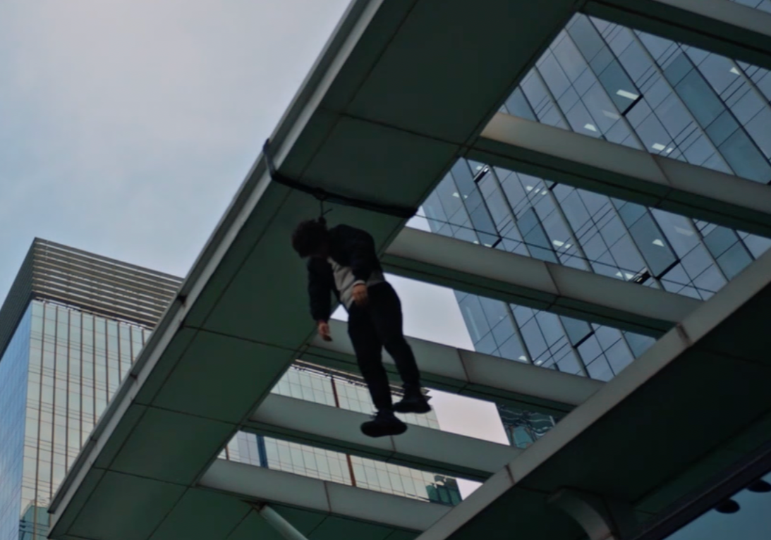 건물 꼭대기에서 미친듯이 돈을 뿌려댄다. 겁에 질린 표정으로 말한다.