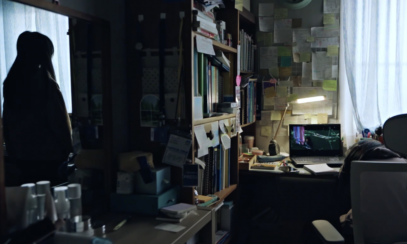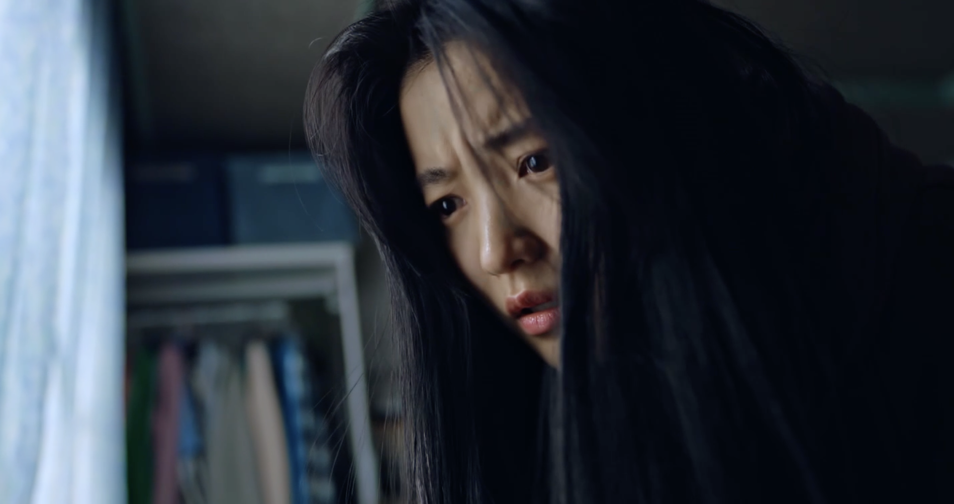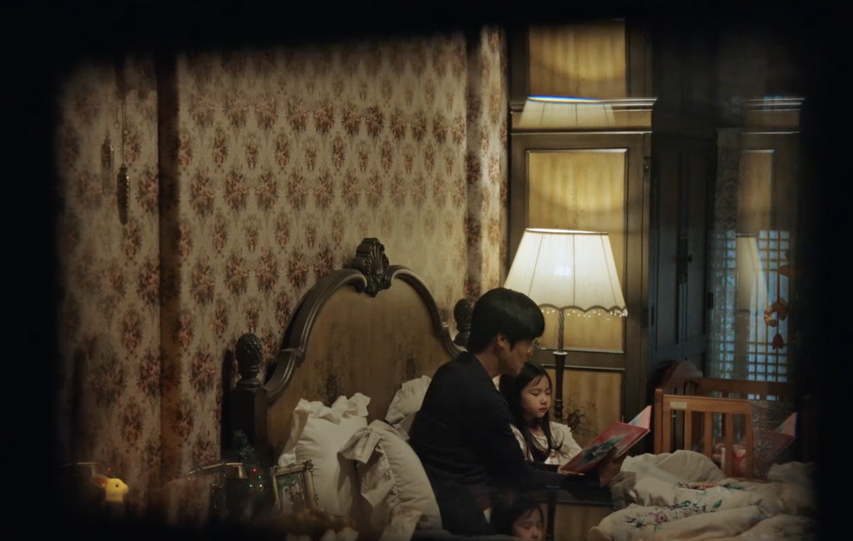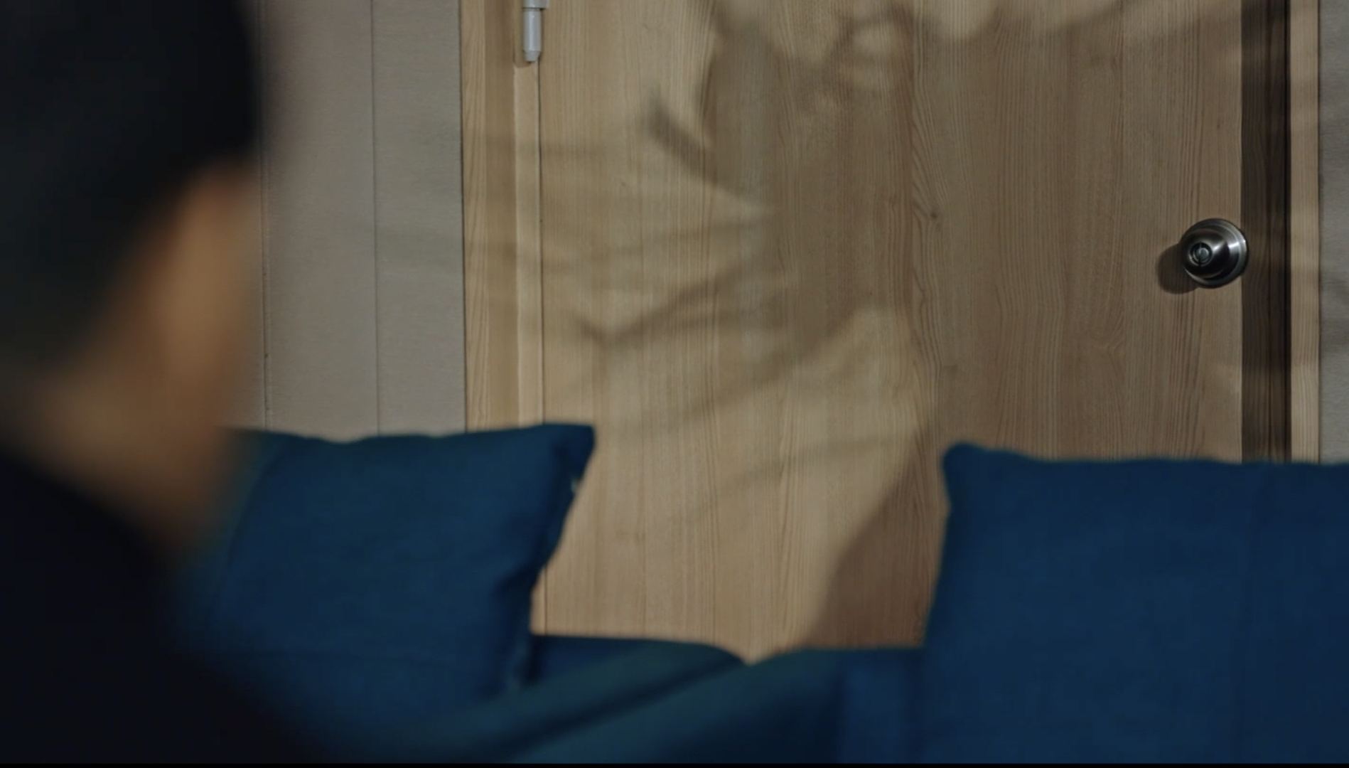 자고 있는 산영의 뒷모습 너머로 거울에 비친, 일어서는 산영의 모습(악귀)는 문밖을 나선다.