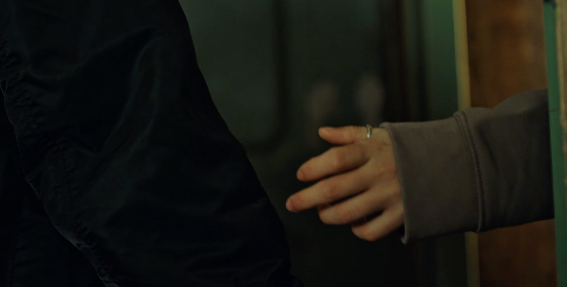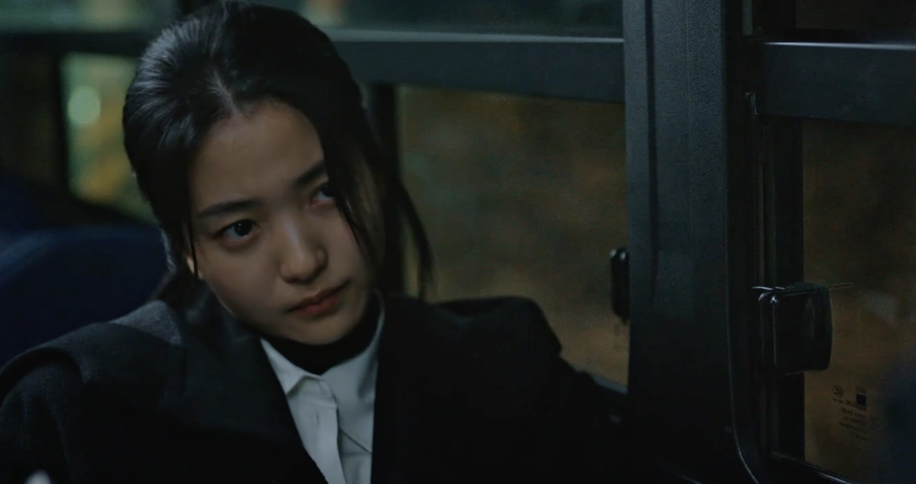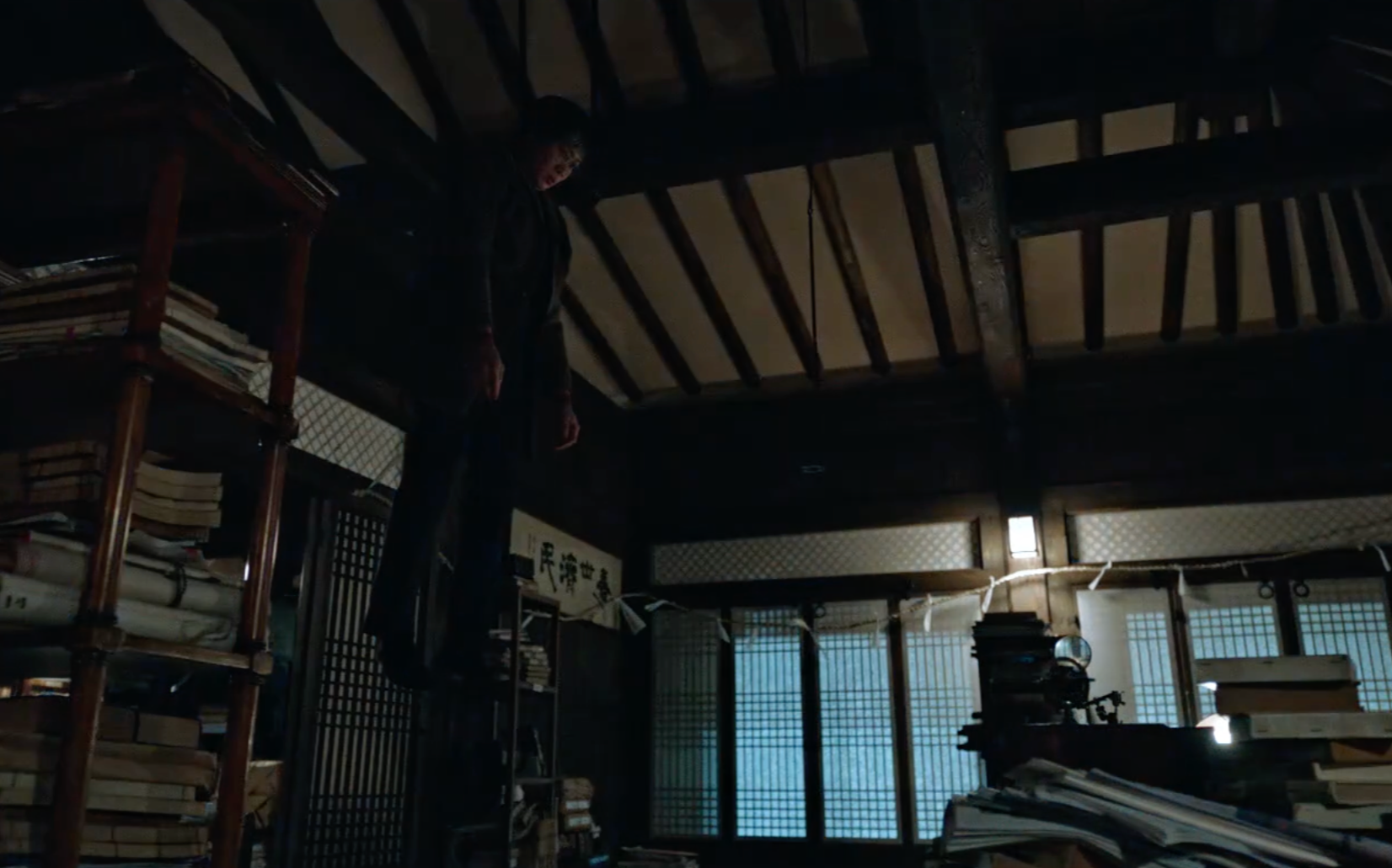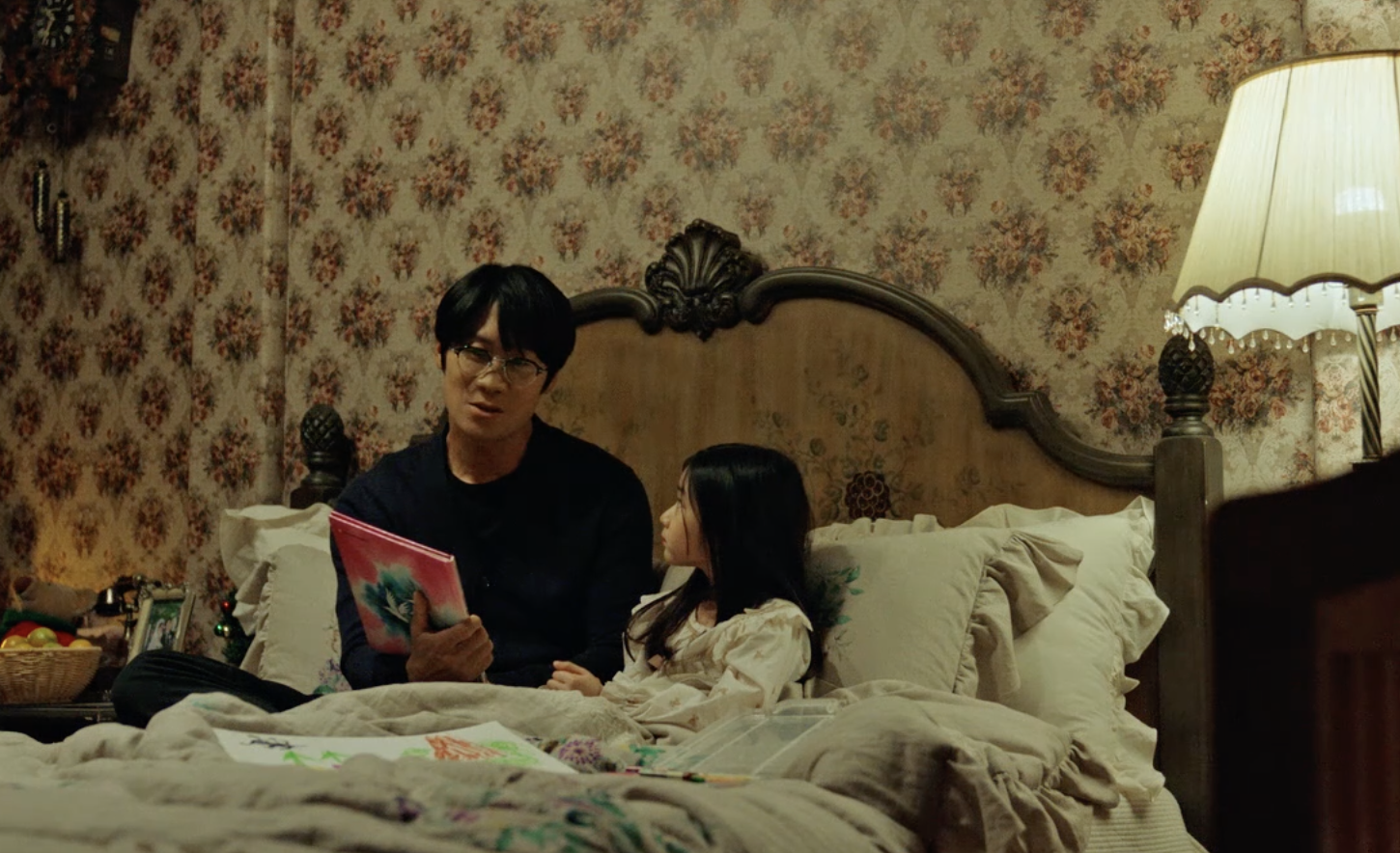 자고 있는 산영의 뒷모습 너머로 거울에 비친, 일어서는 산영의 모습(악귀)는 문밖을 나선다.