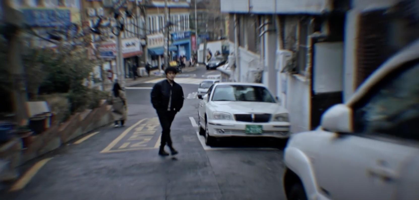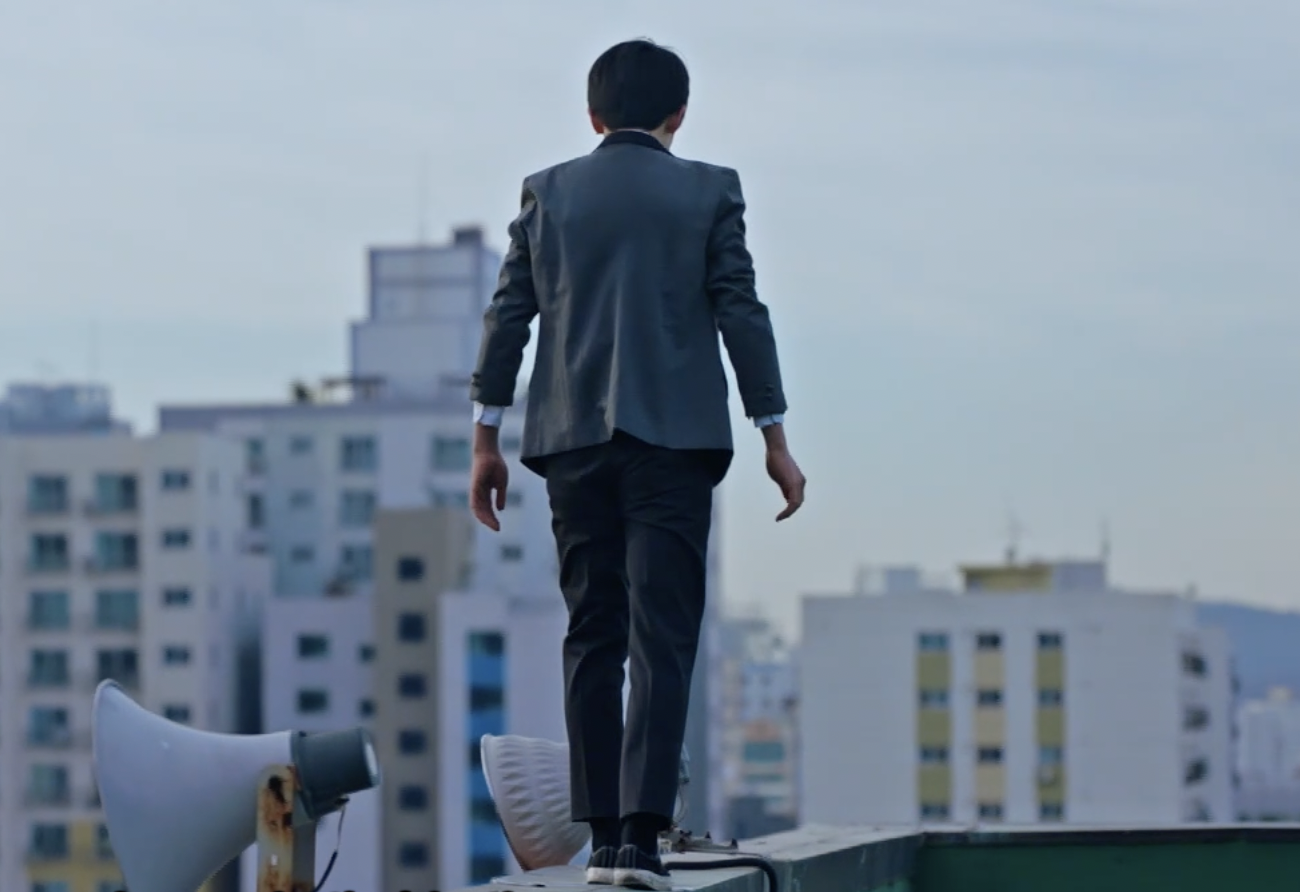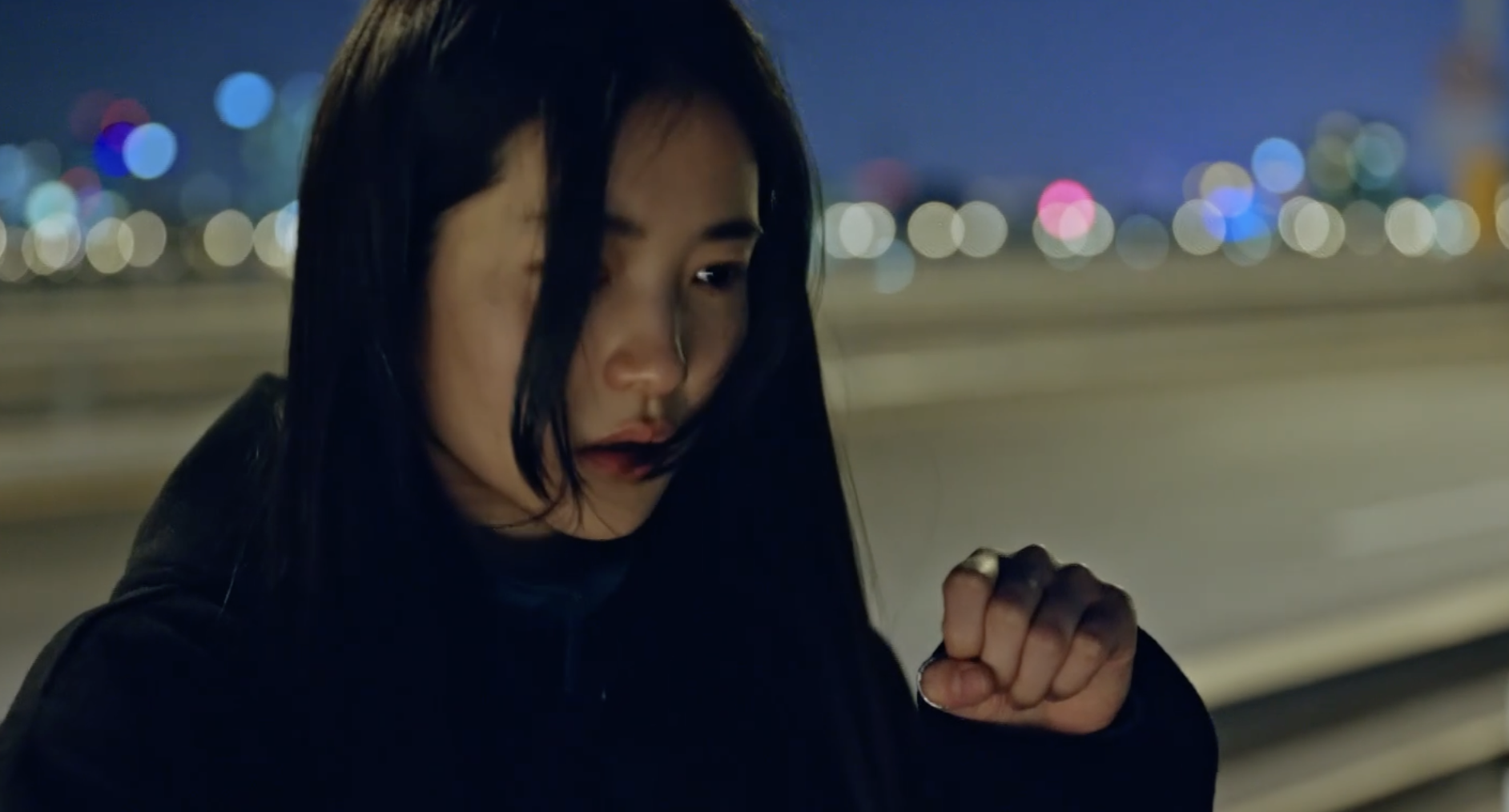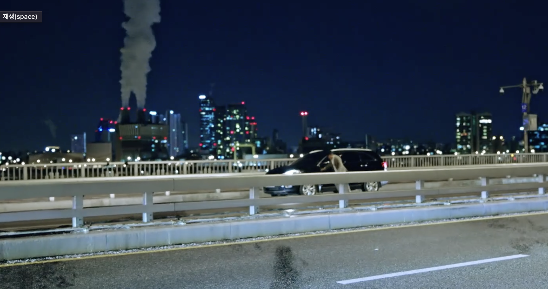 서강대교 다리에서 우두커니 서 있는 구산영. 다리위에 올라서 입을 벌리는 이상한 행동을 한다.