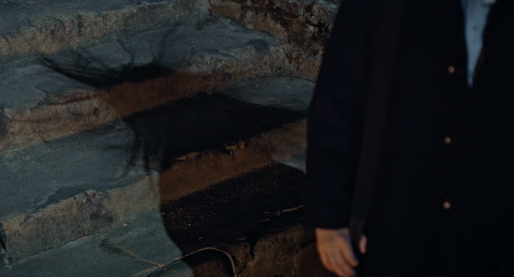 아들의 발걸음 소리가 들리고 천둥치는데 밖에 괴상한 그림자가 비친다.