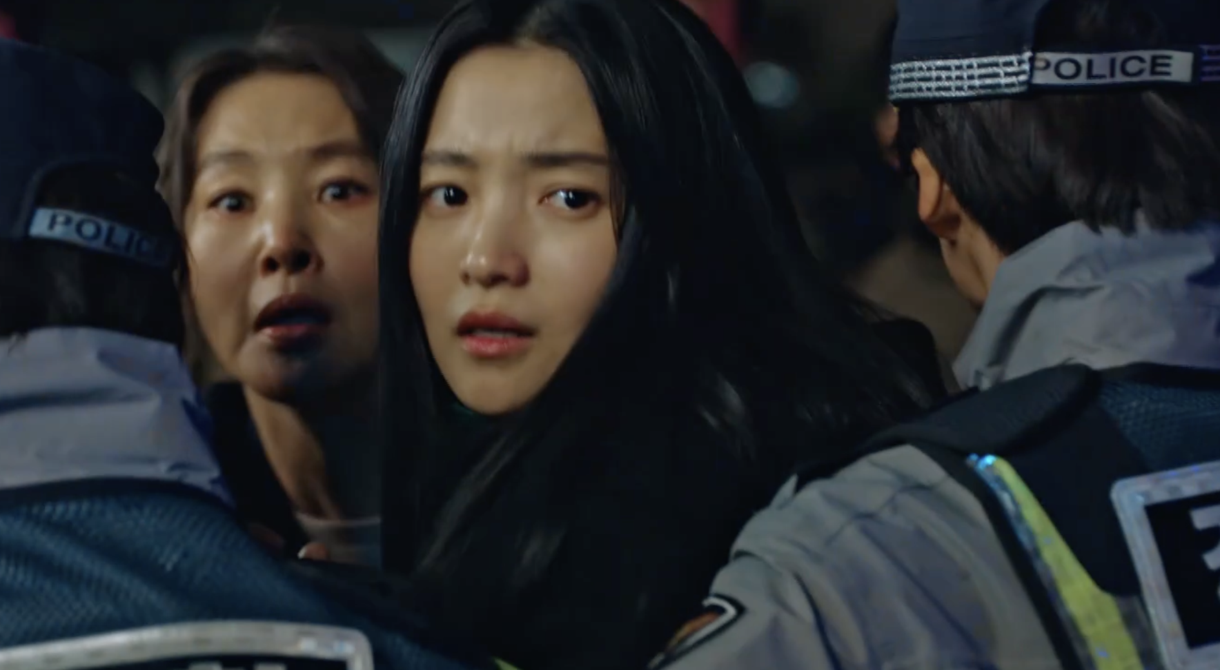 분노하며 악쓰는 산영을 경찰들이 제지한다.