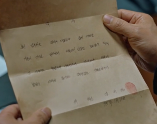 서문춘 형사님이 돌아가실 때.. 아빠가 서명한 유품 수령확인서를 잡으셨어요.