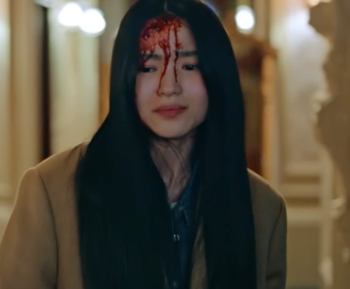 위기에 처하자 주변에 있는 물건을 자신의 머리에 때려 자해하는 산영.