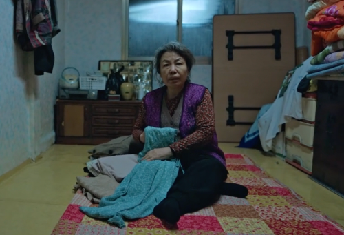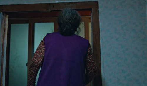 빨래 생각이 나서 뒤돌아 챙겨 문 안으로 들어서는 할머니.