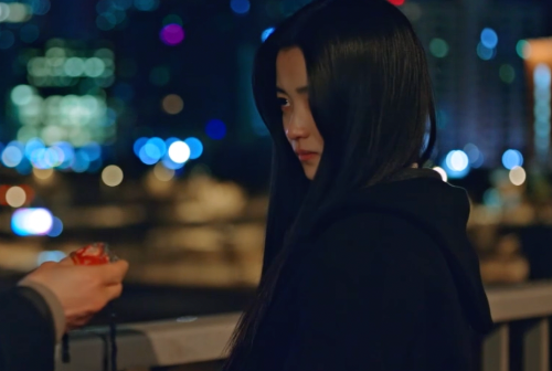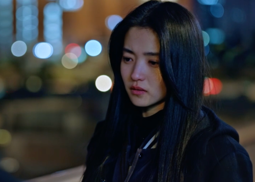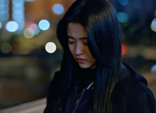 볼을 타고 흘러내리는 눈물. 오른손으로 닦는 산영.