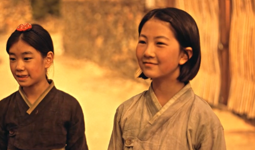 차 문을 벌컥 열고, 댕기머리를 만지고 있는 어린 해상을 보는 엄마.