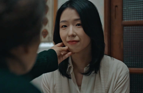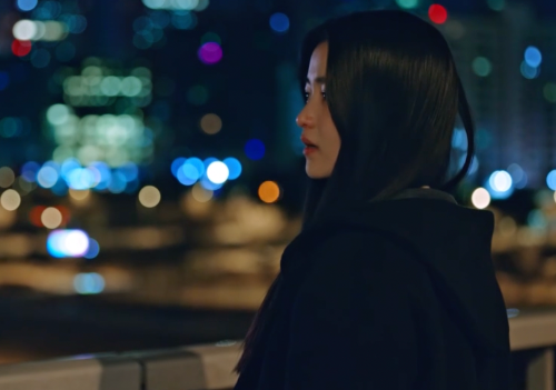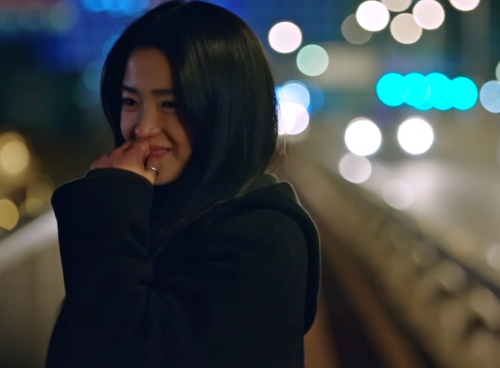 볼을 타고 흘러내리는 눈물. 오른손으로 닦는 산영.