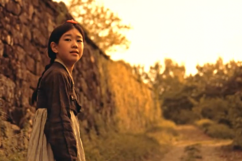 차 문을 벌컥 열고, 댕기머리를 만지고 있는 어린 해상을 보는 엄마.