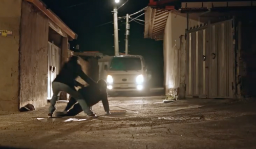 차는 떠나버렸고, 쫒아가다가 바닥에 돈봉투를 내던진다.