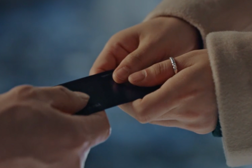 교수에게 카드를 건네는 산영.